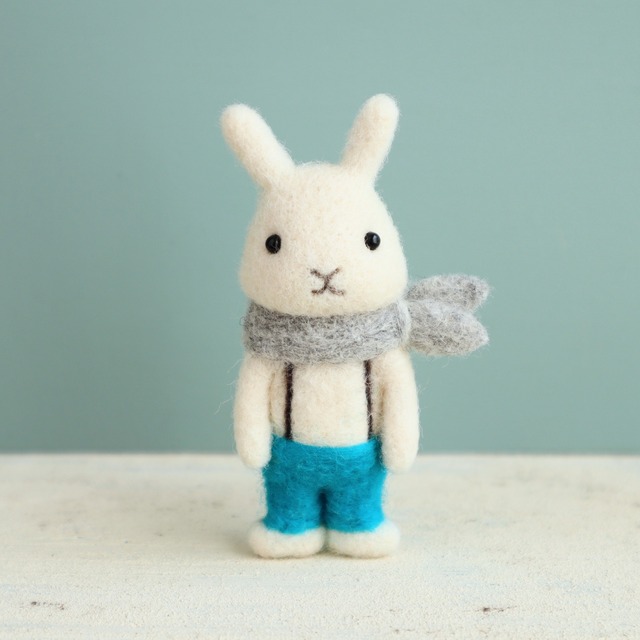 羊毛フェルトブローチ ウサギ ホワイト(つりズボン・水色/スカーフ・グレー)